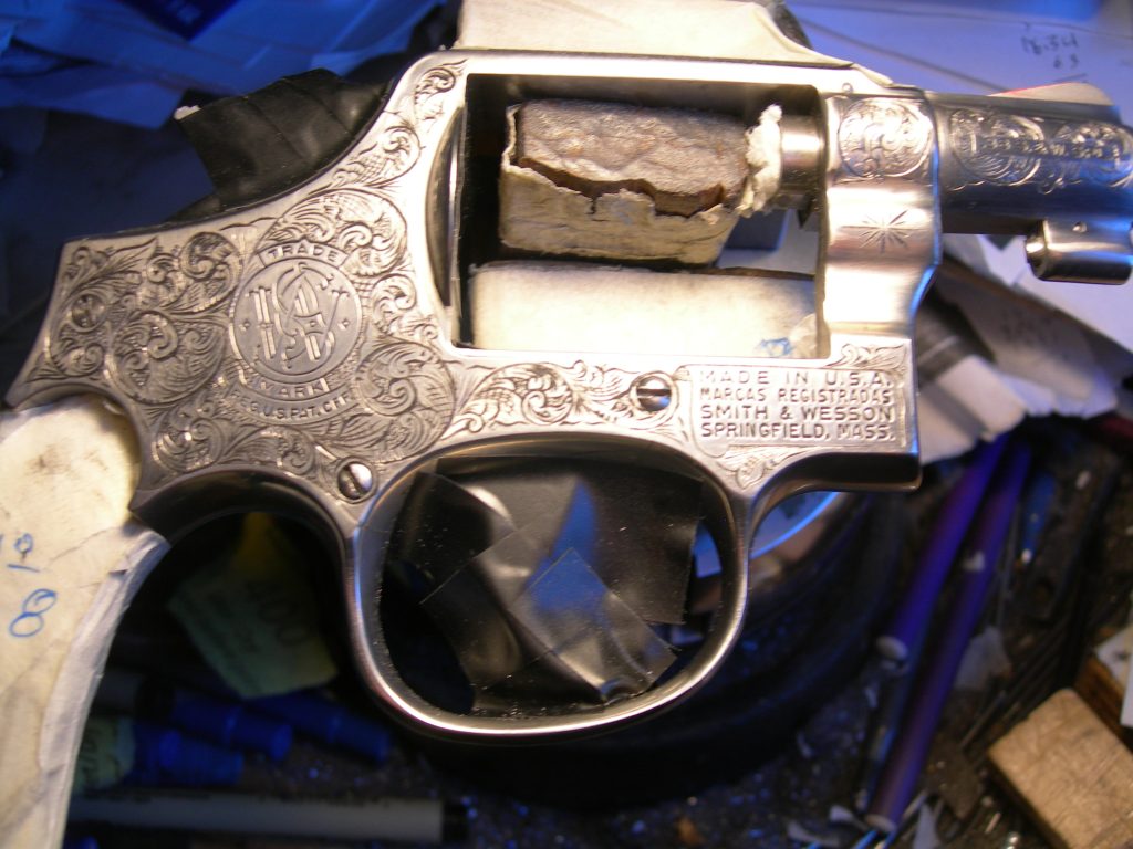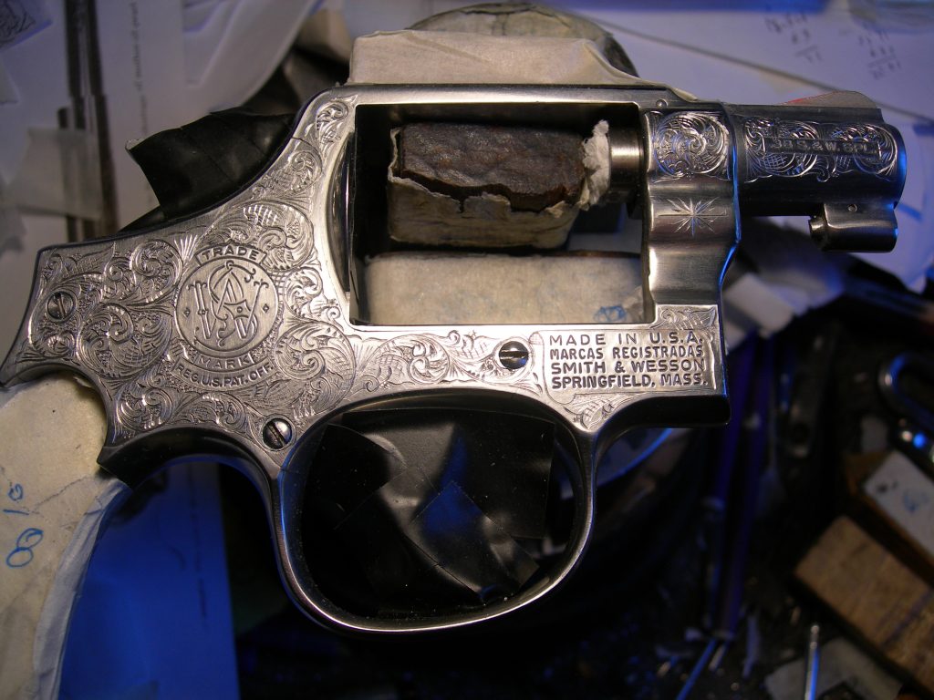 This Smith & Wesson Model 64 is being engraved in American Scroll. These photos shows one side with the un-inked finished cuts and the same side with the cuts inked. More photos to follow in a week or so!