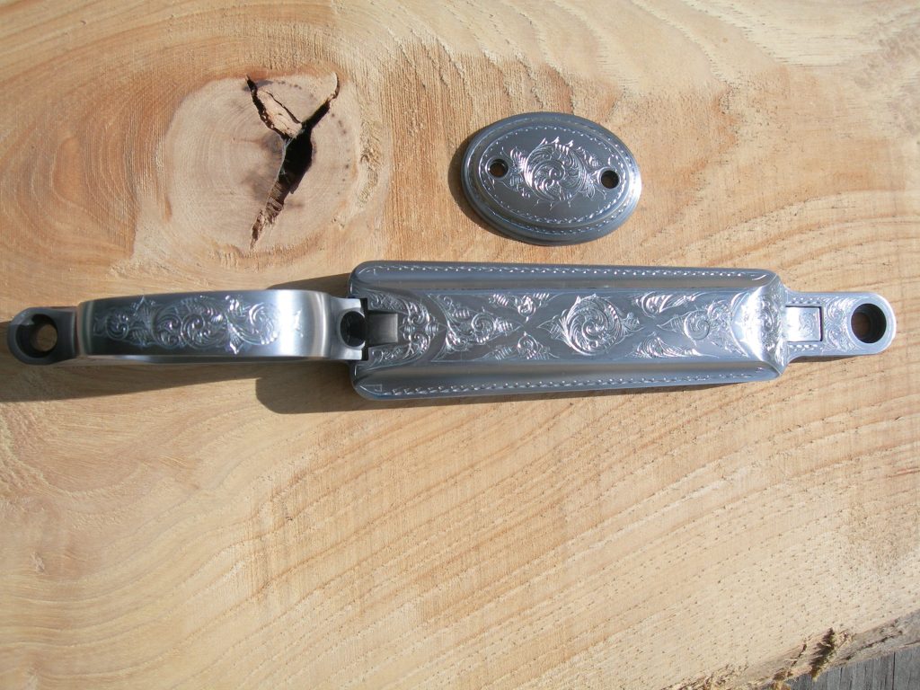 This Henry top cover plate has been stripped of its epoxy finish, the casting has been cleaned up, and polished! Engraved in American Scroll featuring a portrait of the client’s horse. This is a great example of ~50% coverage.