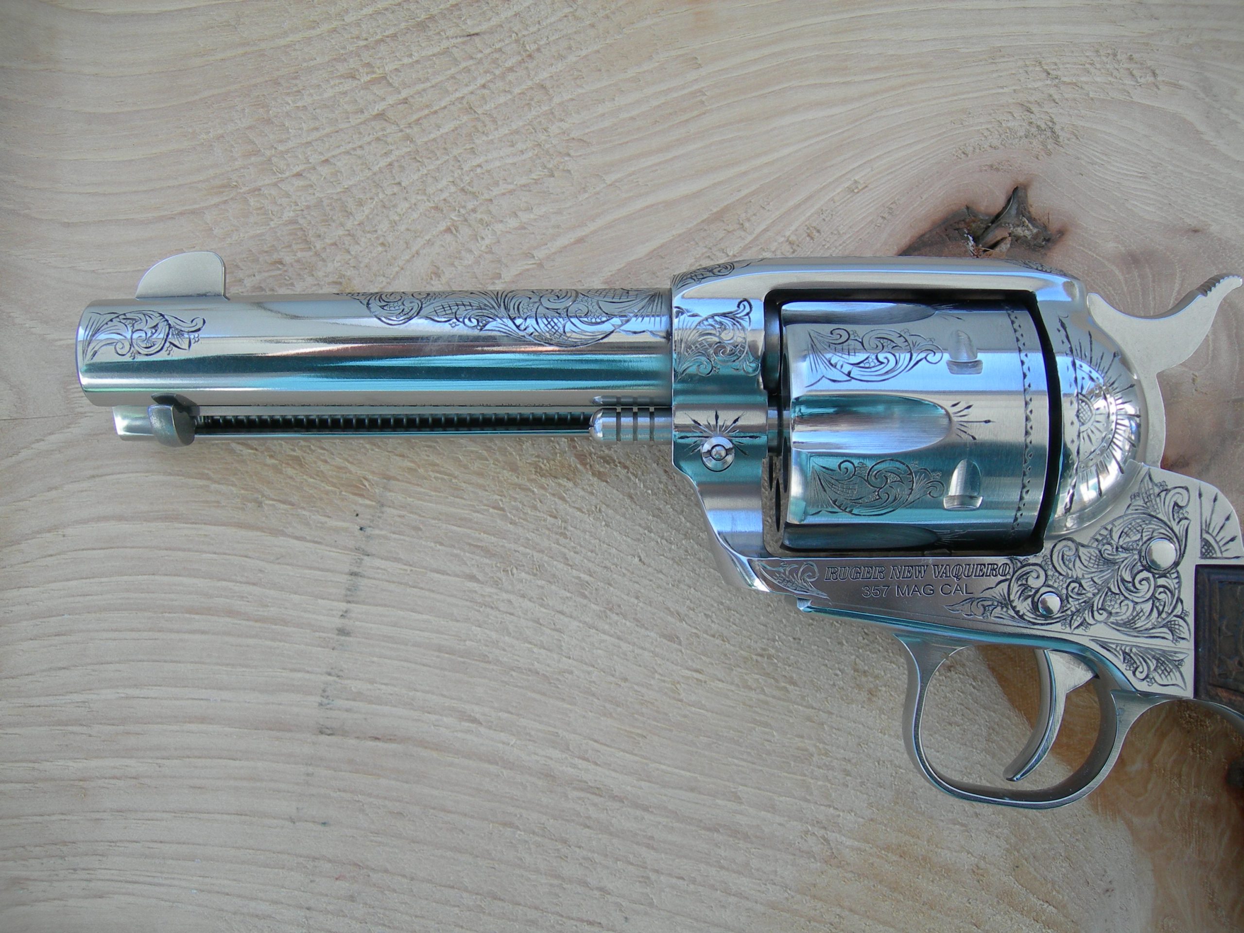 This Ruger Vaquero features full coverage engraving, wrapping completely around the barrel. Virtually everything is engraved save for the hammer and the trigger! It features scrollwork on Ivorex grips.