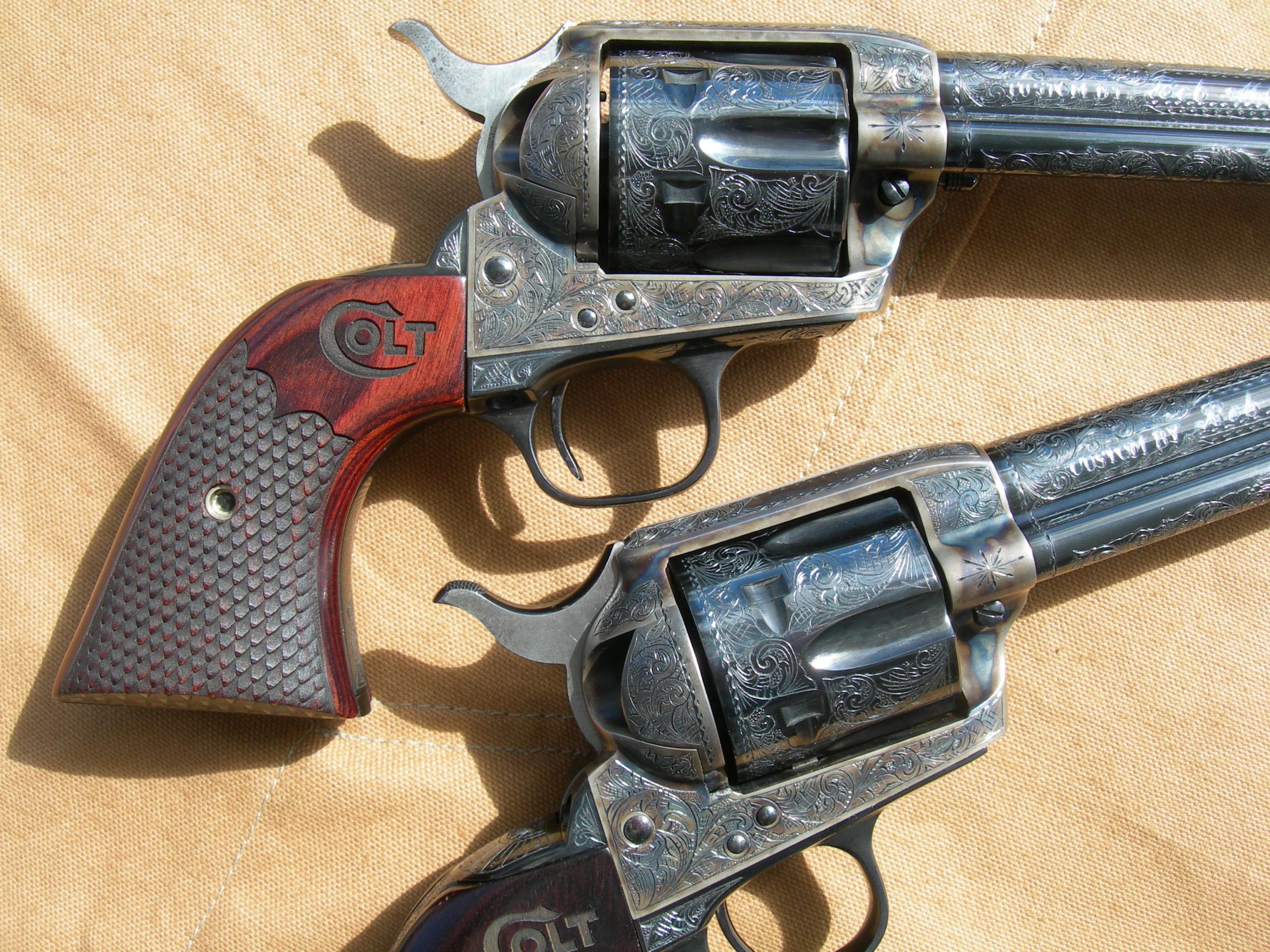 This Ruger New Vaquero revolver will be one of a pair featuring inked scrollwork in the style of Helfricht. This makes this modern iteration of a classic single action look as though it belongs in the 19th century!