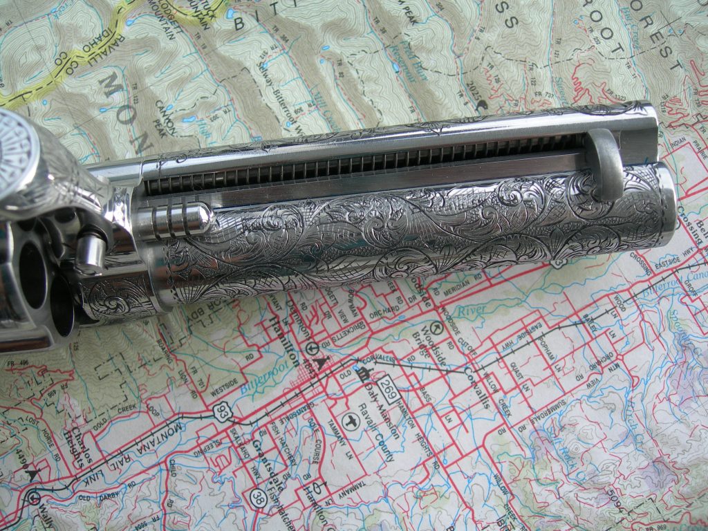 This Ruger Vaquero features full coverage engraving, wrapping completely around the barrel. Virtually everything is engraved save for the hammer and the trigger! It features scrollwork on Ivorex grips.
