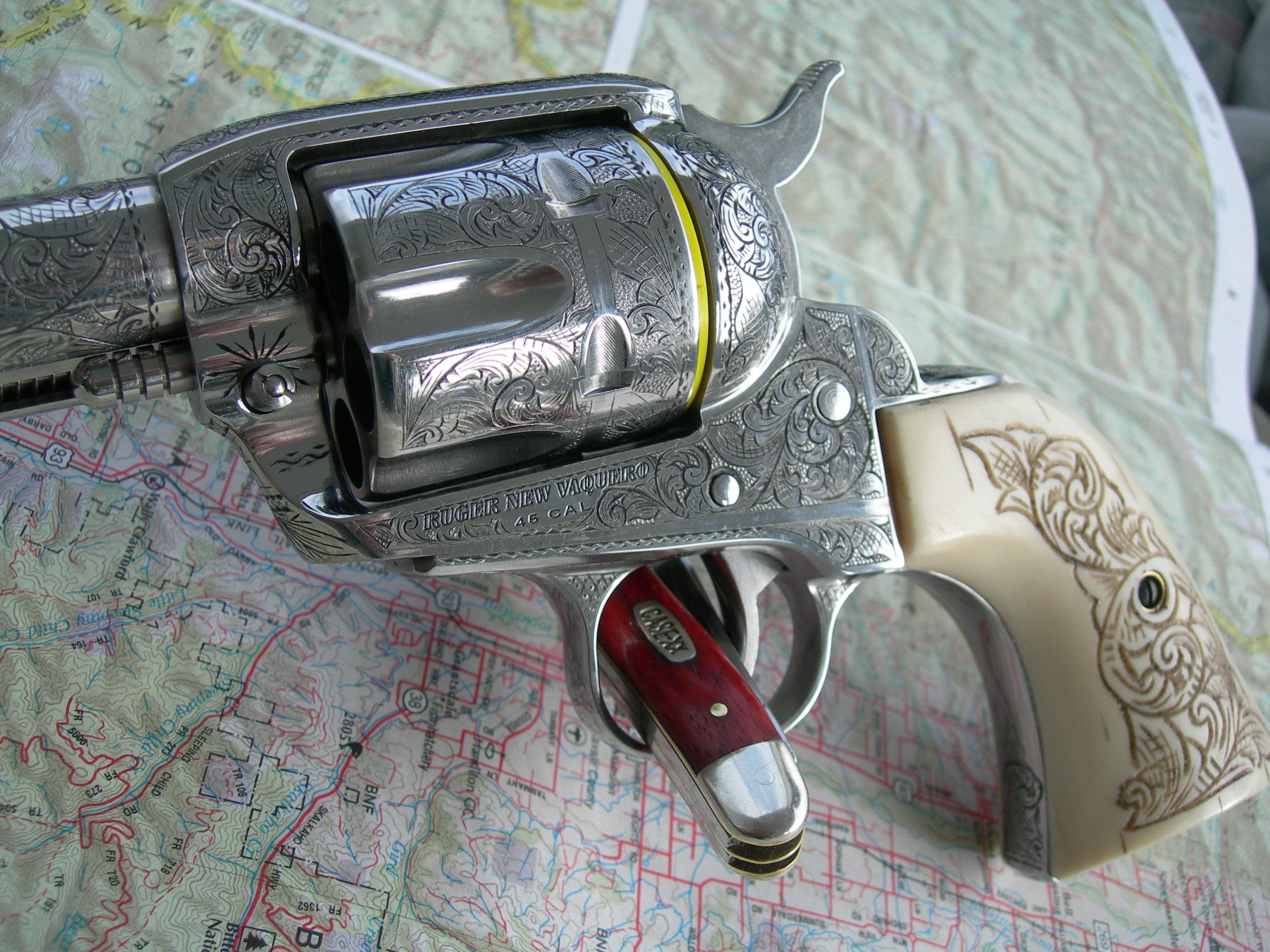 This Ruger Vaquero features full coverage engraving, wrapping completely around the barrel. Virtually everything is engraved save for the hammer and the trigger! It features scrollwork on Ivorex grips.