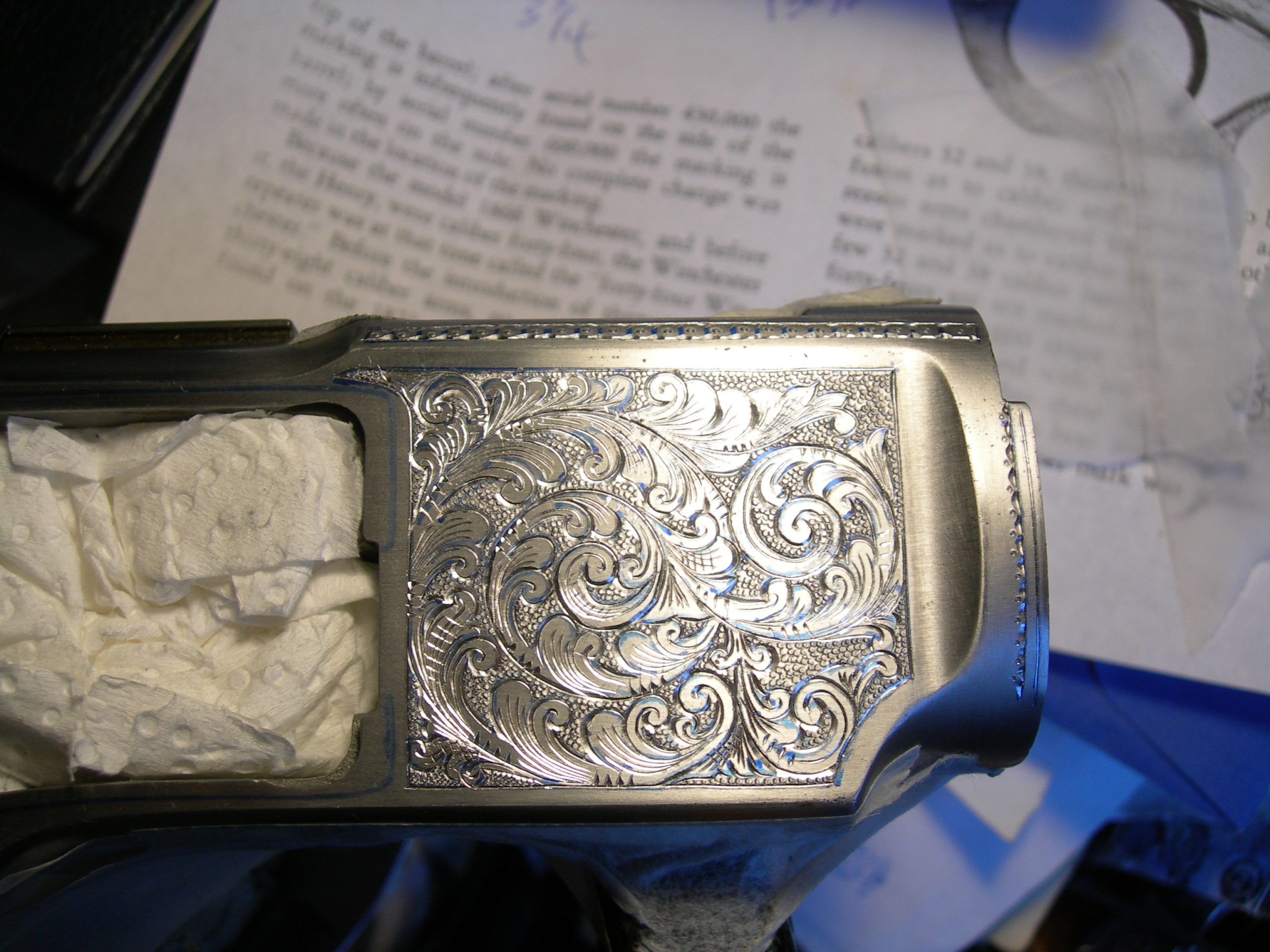 This is a ’73 Winchester, second model, in the process of being fully engraved in a Nimschke-style.