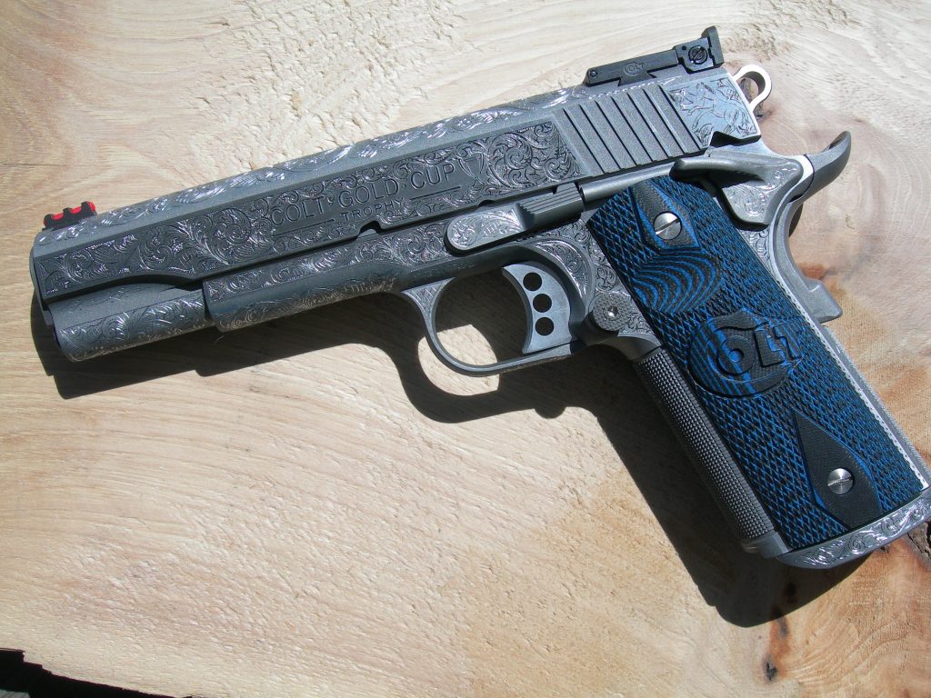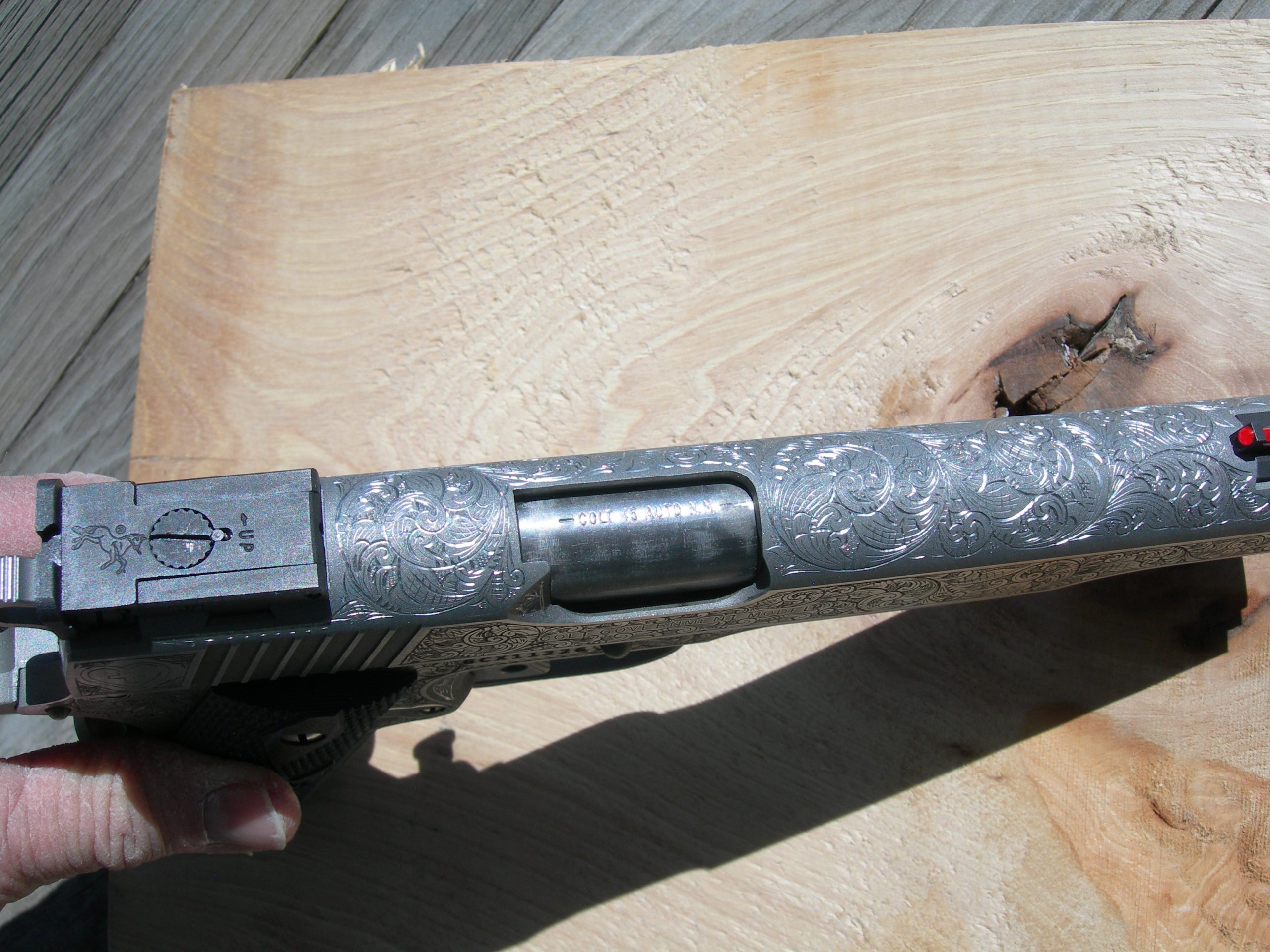 This is an extraordinary, full coverage Colt Gold Cup engraved in American Scroll. This style is based on Gustaf Young, Helfricht, and Nimschke. This is an exceptionally handsome target pistol! It will be the envy of the shooters on the range.